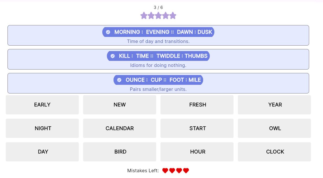 - You can make upto 3 mistakes. The fourth mistake ends the game. Hints are an additional help to complete the game